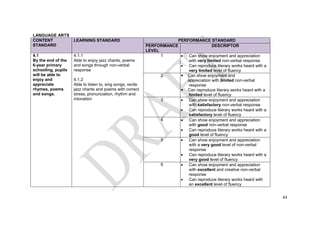 48 515 Able to use prepositions correctly and appropriately. LANGUAGE ARTS 43 CONTENT LEARNING AND PERFORMANCE STANDARDS. All language skills are to be taught through these themes which provide the context for language learning.